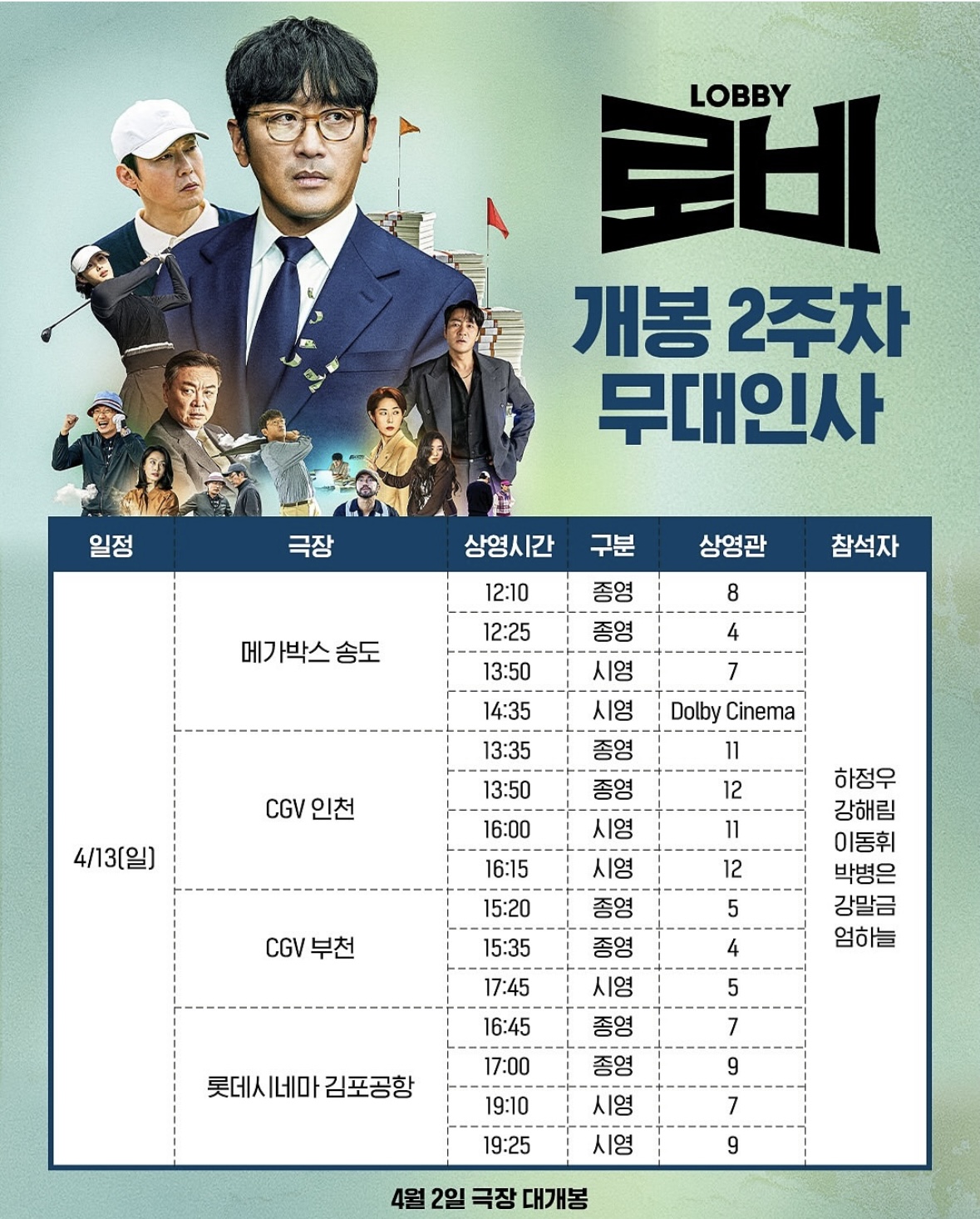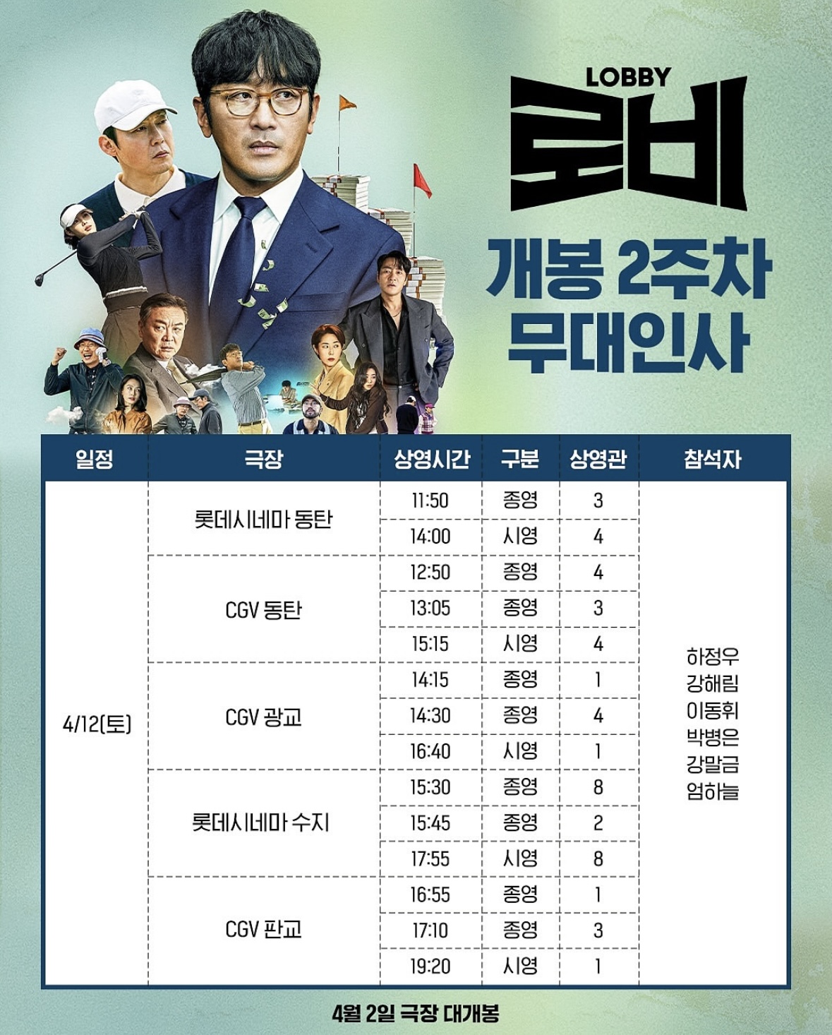 2025년 4월 12일(토) 영화 '로비' 무대인사 일정입니다.