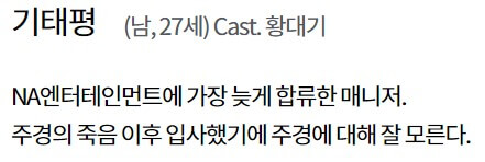 기태평(황대기)은 NA엔터테인먼트에 가장 늦게 합류한 매니저로 주경의 죽음 이후 입사하여 주경에 대해 잘 모릅니다.