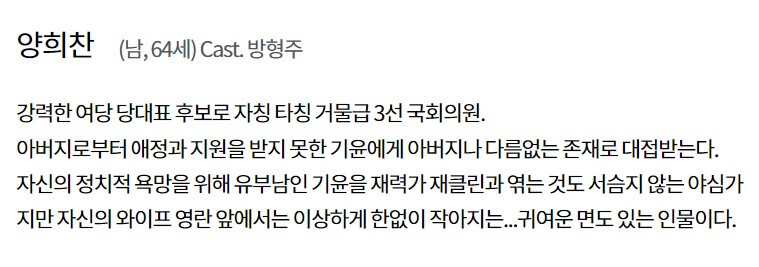 양희찬(방형주)은 여당 당대표 후보로 3선 국회의원입니다. 아버지의 사랑을 받지 못한 기윤에게 아버지 같은 존재이고, 정치적 욕망을 위해 유부남인 기윤을 재력가 재클린과 엮게 됩니다. 하지만 자신의 아내인 영란 앞에서는 한없이 작아지는 귀여운 인물입니다.