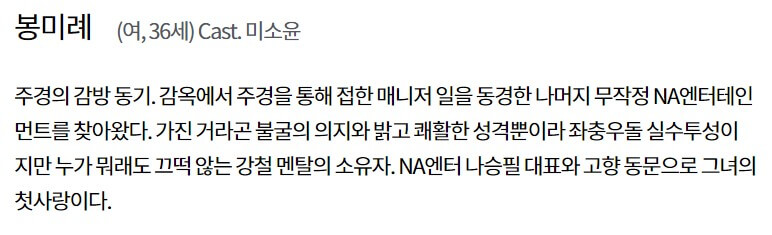 봉미례(미소윤)는 주경의 감방동기로 감옥에서 접한 주경의 매니저 일을 동경해 무작정 NA엔터테인먼트를 찾아갑니다. 강철 멘털의 소유자이며, NA엔터 나승필 대표와 고향 동문으로 그녀의 첫사랑입니다.