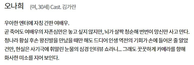 오나희(김가란)는 우아한 엔터에 자칭 간판 여배우입니다. 여배우의 자존심을 잃고 싶지 않지만, 뇌가 청순해 사고를 치고 맙니다.