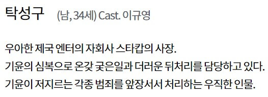 탁성구(이규영)는 우아한 제국 엔터의 자회사 스타캅의 사장입니다. 기윤의 뒤처리를 담당합니다.