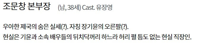 조문창 본부장(유장영)은 우아한 제국의 숨은 실세로, 자칭 장기윤의 오른팔입니다.