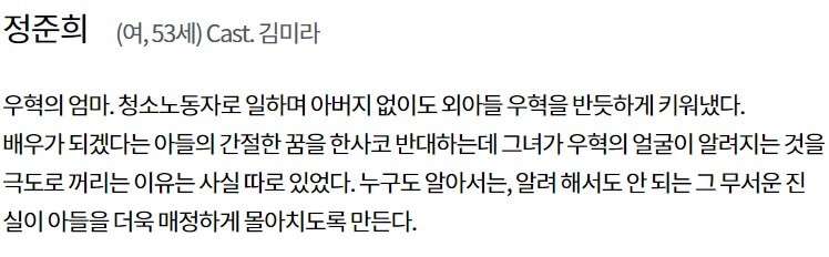 정준희(김미라)는 우혁의 엄마로 청소노동자로 일하고 있습니다. 아들 우혁이 배우가 되는 것을 반대하는데 그 이유는 우혁의 얼굴이 세상에 알려지면 안 되기 때문입니다.