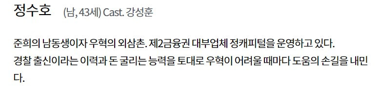 정수호(강성훈)는 준희의 남동생이자 우혁의 외삼촌입니다. 제2금융권인 대부업체 정캐피털을 운영하고 있습니다.