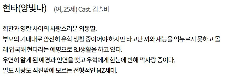 현타, 양빛나(김솔비)는 희찬과 영란 사이의 외동딸이며, 현타라는 예명으로 BJ로 활동 중입니다. 일과 사랑 모두 직진밖에 모르는 전형적인 MZ세대로 우혁에게 한눈에 반해 짝사랑 중입니다.