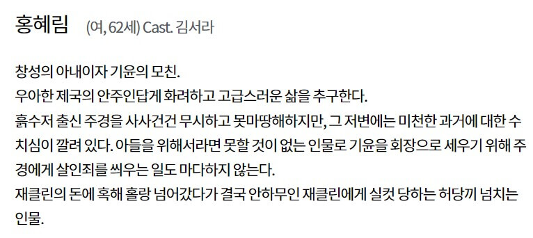 홍혜림(김서라)은 창성의 아내이자 기윤의 모친입니다. 아들 기윤을 회장으로 세우기 위해 주경에게 살인죄를 씌우기도 하고, 재클린의 돈에 넘어갔다가 안하무인 재클린에게 당하는 허당끼 넘치는 인물입니다.