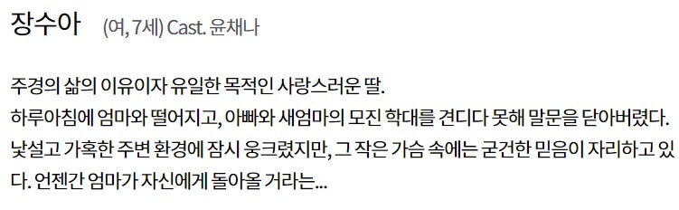 장수아(윤채나)는 주경의 사랑스러운 딸입니다. 하루아침에 엄마와 떨어지며, 아빠와 새엄마의 학대를 견디다 못해 말을 하지 않게 되는데 내면에서는 엄마가 자신에게 돌아올 거라는 굳건한 믿음을 가지고 있습니다.