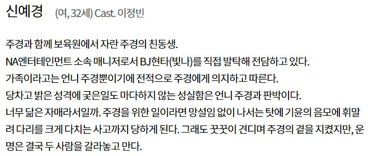 신예경(이정빈)은 주경과 함께 보육원에서 자란 주경의 친동생입니다. NA엔터테인먼트 소속 매니저로 BJ현타(빛나)를 직접 발탁해 전담하고 있습니다. 당차고 밝은 성격이며 궂은일도 마다하지 않는 성실함을 가졌습니다.