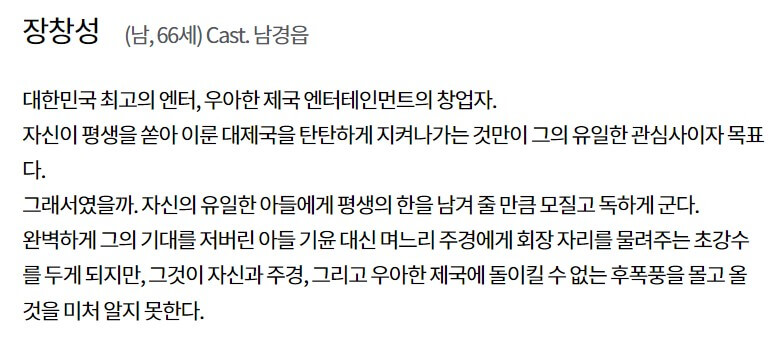 장창성(남경읍)은 우아한 제국 엔터테인먼트의 창업자입니다. 자신의 기대를 저버린 아들 기윤 대신 며느리 주경에게 회장자리를 물려주게 되며, 이를 통해 후폭풍을 맞이하게 됩니다.