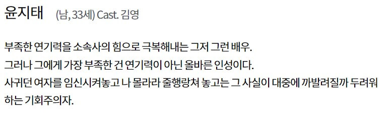 윤지태(김영)는 연기력이 부족하지만 소속사의 힘으로 극복하는 배우입니다. 하지만 가장 부족한 건 인성인데 사귀던 여자를 임신시켜 놓고 나 몰라라 줄행랑쳤습니다.