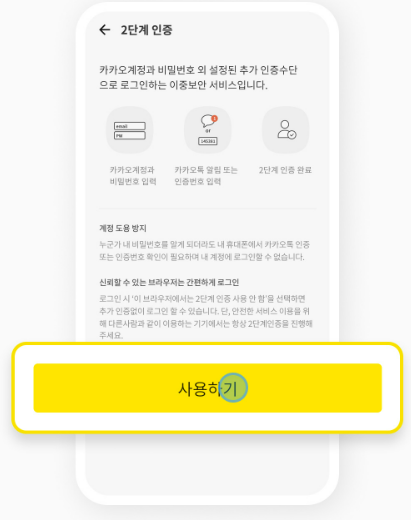 카카오계정 비밀번호를 입력 후, 2단계 인증에 대해 읽어보고 '사용하기' 버튼을 클릭합니다.