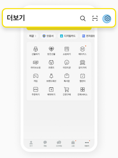 더보기 탭에서 상단 톱니바퀴 모양의 '설정'을 클릭합니다.